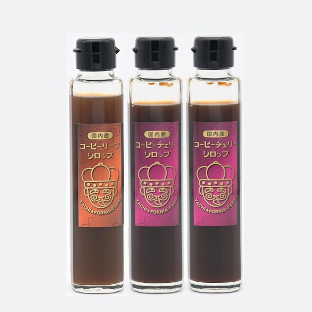 単品発売もしている国産チェリーシロップ2本、国産リーフティーシロップ1本のお得な三本セットです。 シロップはお湯割り・水割り・ソーダ割りなどで手軽にお飲み頂けます。 単品でご購入頂くよりお得な商品ですのでそれぞれの味をお楽しみ頂く際にはこちらをご購入下さい。 本商品1本で5~6杯の水割り、お湯割り、ソーダ割りなどをお楽しみ頂けます。 【コーヒーチェリーシロップ】 コーヒーはコーヒーの木からなる実の種です。ジャスミンのような白い花を咲かせた後、さくらんぼのような赤い実をつけます。 この果実はその見た目から「コーヒーチェリー」と呼ばれます。 「コーヒーチェリー」の中には2 粒の種子が入っており、この種子がコーヒー豆のもとになります。この種子を乾燥させ、焙煎したものがコーヒー豆です。 コーヒー豆を取り除いた後の果皮を発酵させて煮詰めてシロップにしたものがコーヒーチェリーシロップです。 プラムやいちじくのような果実の甘みとアプリコットやローズヒップのような華やかな味わいが特徴です。 カフェインはほとんど種(コーヒー豆)に含まれているため、コーヒーチェリー自体は低カフェインで妊婦の方や夜でも安心して飲むことができます。 海外では徐々にコーヒーチェリーを使用したドリンクが広まっていますが、まだ日本では珍しい商品です。 希少な国産のコーヒーチェリーシロップは、ヤチフォルニアならではのこだわりの一品です。 私たちは「コーヒーチェリー」を広く知ってもらい、その価値を上げて市場での人気を獲得することを目指しています。将来的には、原産国の方々が「コーヒーチェリー」の担い手として適正な労働価値を得ることで、コーヒー原産国が少しでも豊かになることを願っています。 また、コーヒーチェリーを廃棄することで環境汚染が問題となっているため、それを美味しく楽しむことが産地の課題解決や地域社会の発展支援にもつながるのです。 多くの方にコーヒーチェリーを知っていただきたい、そんな思いのこもった商品です。 お召し上がり方 炭酸水で割ると「コーヒーチェリーソーダ」、ミルクで割ると「コーヒーチェリーオレ」、焼酎で割ると「コーヒーチェリーサワー」、またはお好みのアルコールで「カクテル」など、さまざまな飲み方がおすすめです。 フルーティーな風味と甘みを活かして、アイスやヨーグルト、かき氷、フレンチトーストにかけるシロップとしてもお使いいただけます。 コーヒーチェリーティーとして楽しむには、お湯を注ぎ、シナモンやナツメグを加えると、香り高く気分が華やぐ飲み方がおすすめです。 また、温めたミルクにコーヒーチェリーシロップとシナモンやジンジャーを加えると、やさしい甘さで身体があたたまるホットドリンクになります。 ほんのりとコーヒーチェリーの香りに包まれます。 【コーヒーリーフシロップ】 コーヒーから採れるものは、果実だけではありません。 青々と艶やかな葉っぱからお茶も作れるのです。 コーヒーの木には捨てる部分がなく、まさにSDGs(持続可能な開発目標)に適していま す。 その葉っぱを煮詰めて作ったコーヒーリーフシロップは、穏やかな味わいで渋みがほとんどなく、後味に少し甘味を感じます。このシロップに、はちみつとレモンを加えたことで、すっきりとしたミントのような味わいになりました。 また、コーヒーリーフシロップには、糖尿病や肥満予防に利用されているクロロゲン酸や、認知症や抗がん作用など様々な効果が期待されているトリゴネリン、抗酸化作用が期待できるマギフェリンなどが含まれています。 【お召し上がり方】 炭酸水で割って「コーヒーリーフソーダ」、ミルクで割って「リーフオレ」、焼酎と割って「コーヒーリーフーサワー」やお好みのアルコールで「カクテル」などにもおすすめです。 お湯で割って生姜を加えて「コーヒーリーフジンジャーティー」アイスやヨーグルトに加えても美味しくいただけます。 「コーヒーチェリーシロップ」 ・内容量 : 150g ・原材料. : コーヒーの実の果皮、砂糖、レモン果汁、はちみつ 「コーヒーリーフシロップ」 ・内容量 : 150g ・原材料. : コーヒーの葉、砂糖、レモン果汁、はちみつ ※ 30ccのシロップに対して、90〜100ccの炭酸水で割るのが目安ですが、お好みに応じて調整してください。 シロップについて ・保存方法 : 冷暗所で保存 ・賞味期限 : 製造から1年 ・注意事項 : 開封後は冷蔵庫に保管して、お早めにお召し上がりください。 容器の底に一部成分が沈殿する場合がありますが、味や品質には問題ありません。